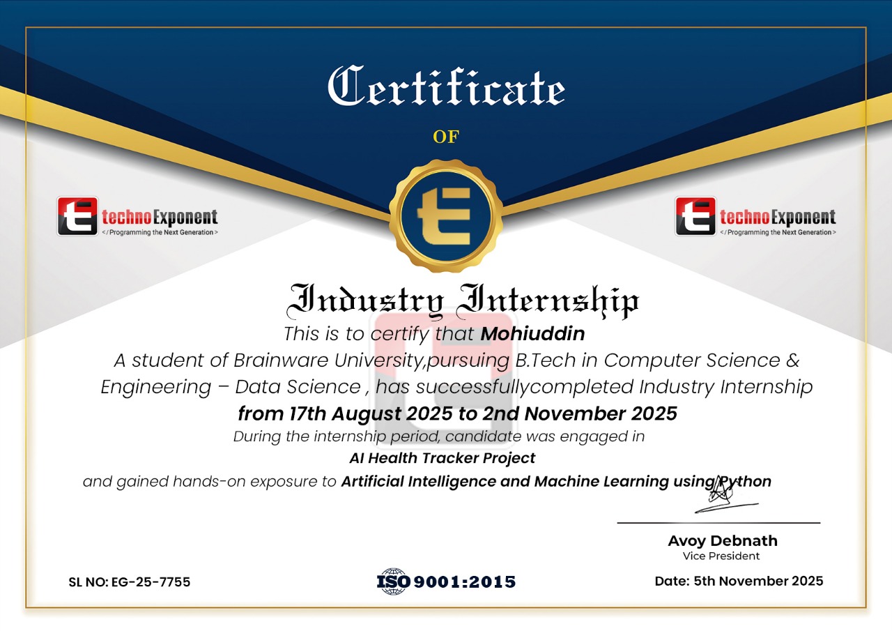 Successfully completed an Industry Internship focusing on **Artificial Intelligence and Machine Learning** applied to a health tracking project.
